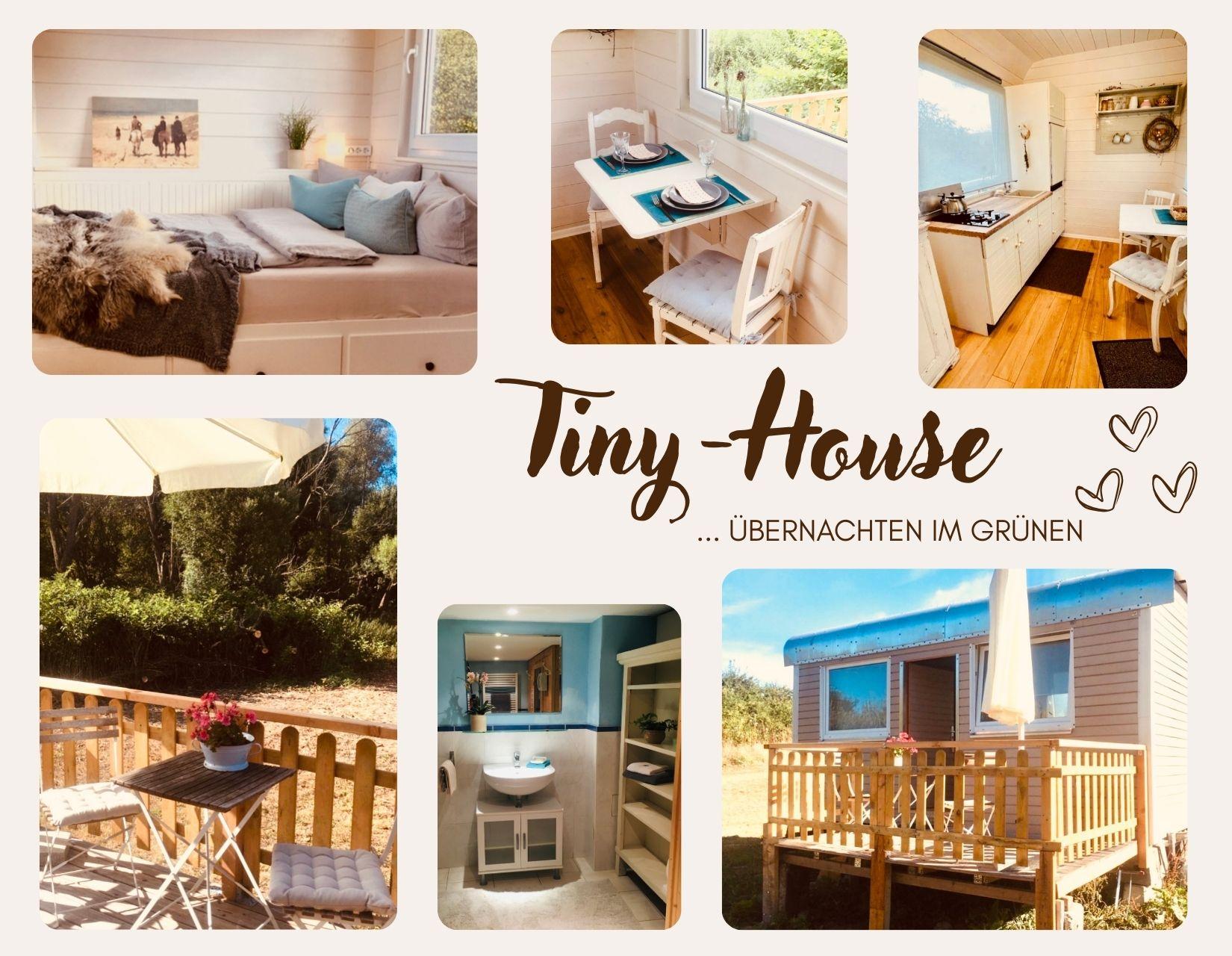 Das Tiny-Häuschen befindet sich auf einem separatem Wiesengrundstück über dem Haupthaus. Es besteht aus einem Schlafbereich, einer kleinen Küchenzeile und einer Essecke. Auf der Terrasse kannst Du die Sonne genießen – uneinsehbar und umgeben von Sträuchern und Bäumen. Das dazugehörige separate Dusch-Bad ist im Haupthaus gelegen – 50 m entfernt und mit WC, italienischer Dusche natürlich mit Warmwasser, Föhn und Seife ausgestattet.