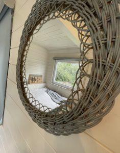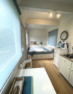 Das Tiny-Häuschen befindet sich auf einem separatem Wiesengrundstück über dem Haupthaus. Es ist mit einem 1,40 m breiten Bett ausgestattet, einer kleinen Küchenzeile und einer Essecke. Die Sonne können Sie auf der Terrasse genießen – uneinsehbar und umgeben von Sträuchern und Bäumen. Das dazugehörige separate Dusch-Bad ist im Haupthaus gelegen.