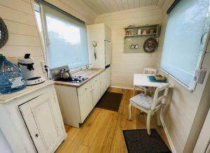 Das Tiny-Häuschen bietet Platz für max. 2 Personen, dies auf ca. 12 qm. Ein 1,40 m-breites Doppelbett lädt zum Sternengucken ein. Die Küche im Tiny-Häuschen ist mit einem Kühlschrank mit Eisfach, einem Gaskochfeld, Toaster, Küchentücher und Spülmittel, einer Grundausstattung wie Töpfe, Pfannen, Sieb, Teesieb, Geschirr wie Teller, Schüsseln, Tassen und Gläsern ausgestattet. Hier können unsere Gäste ihre eigenen Speisen zubereiten und diese am Eßtisch oder auf der Terrasse genießen.